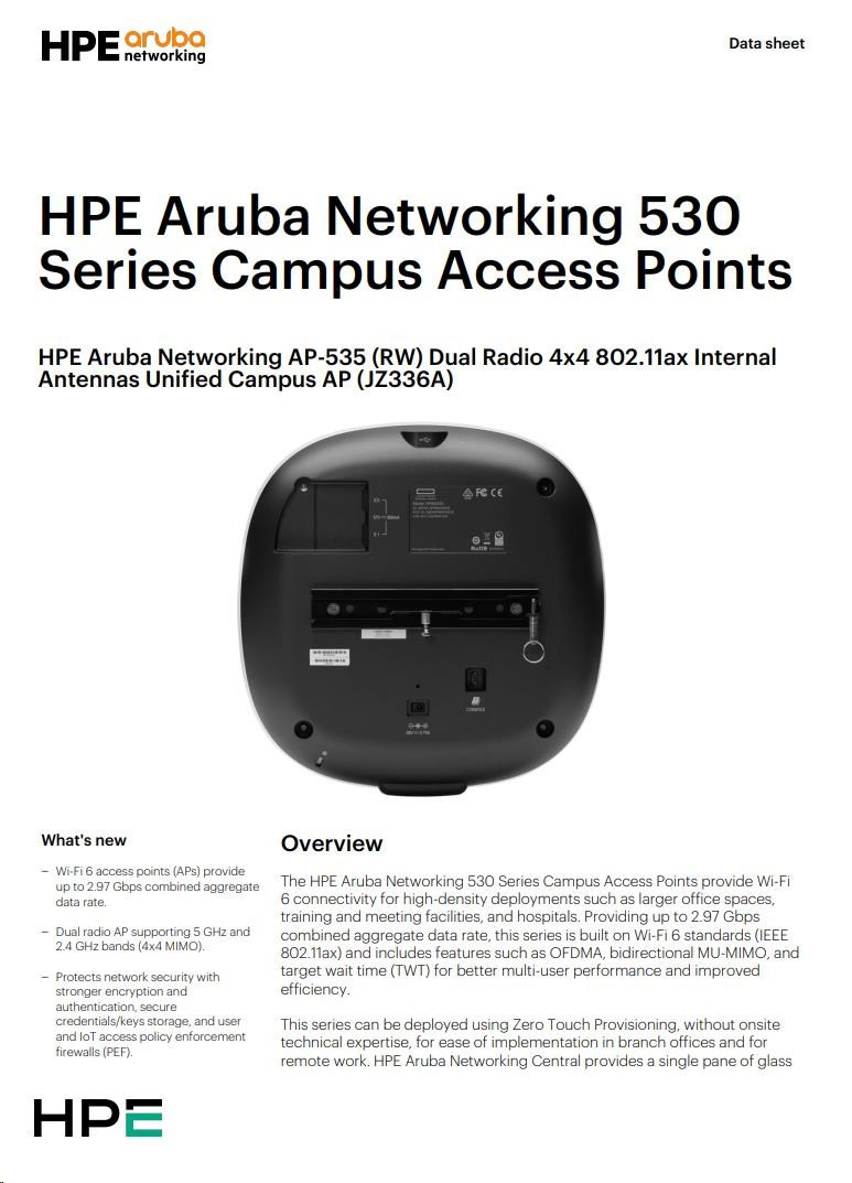 Aruba Wi-Fi 6 access points provide high-performance connectivity for any organization experiencing growing numbers of IoT and mobility requirements. With a maximum aggregate data rate of 3.55 Gbps (HE80/HE40), the Aruba 530 Series deliver the speed and reliability needed for any enterprise.