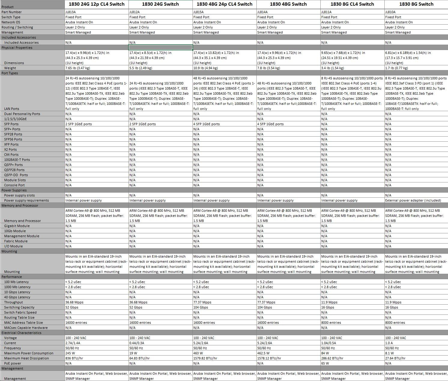 Aruba Instant On 1830 8G Switch (JL810A) | Aruba Instant On 1830 8G 4p Class4 PoE 65W Switch (JL811A) | Aruba Instant On 1830 24G 2SFP Switch (JL812A) | Aruba Instant On 1830 24G 12p Class4 PoE 2SFP 195W Switch (JL813A) | Aruba Instant On 1830 48G 4SFP Switch (JL814A) | Aruba Instant On 1830 48G 24p Class4 PoE 4SFP 370W Switch (JL815A) | ||||||||