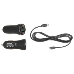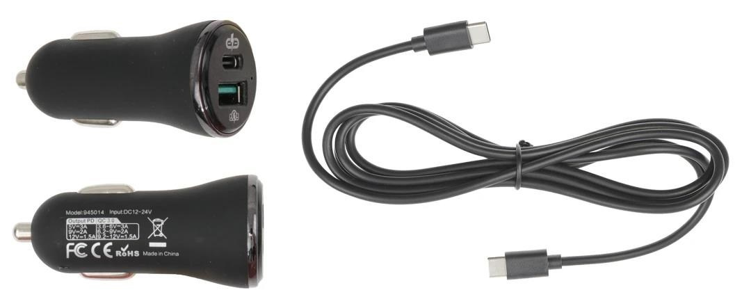 Cig-Plug Adapter, USB-A and USB-C interface, Quick Charger 3.0, 5V, 2.4A, incl.: USB-C to USB-C cable.