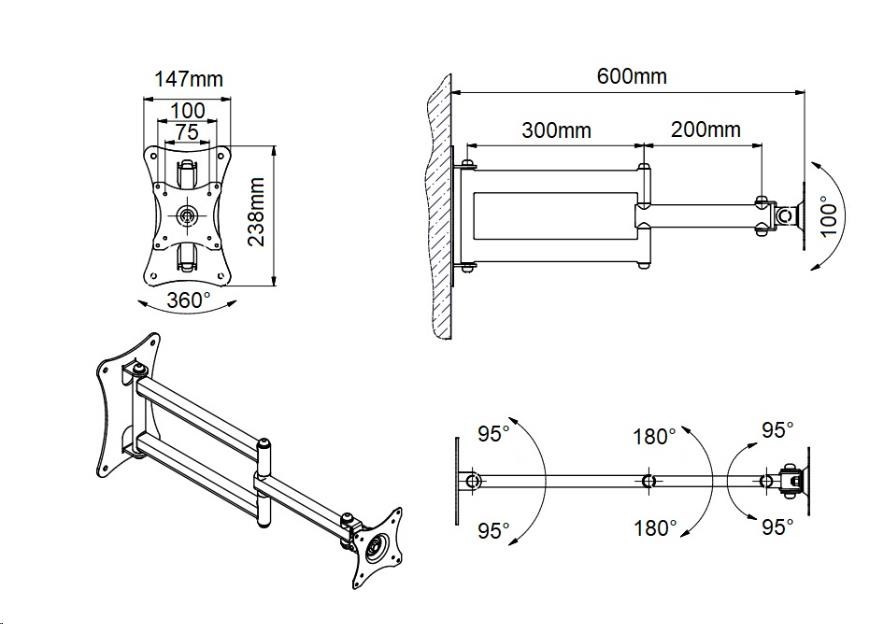 Kompletní specifikace Držák Tv nebo monitoru EDBAK GD26 Profesionální držák na televizi nebo monitor 15-43", otočný, sklopný, délkově nastavitelný, funkce pivot, VESA 75x75 a 100x100, nosnost 15kg Nástěnný držák vynikající kvality a robustní konstrukce pro zavěšení televize nebo monitoru 15-43". Držák podporuje VESA standardy 75x75 a 100x100, je možné zakoupit VESA rozšíření na 200x100 a 200x200. Po zavěšení Tv na držák můžete obrazovku otáčet na obě strany i kolmo ke zdi, naklápět nahoru a dolů, přetočit ji na šířku nebo na výšku. Vzdálenost od zdi lze nastavit v rozmezí 90-600mm. Držáky GD26 můžete zakoupit ve třech barevných variantách: černý, stříbrný nebo bílý. Nosnost držáku je 15kg. Záruka 5 let. Polohovatelný otočný sklopný a délkově nastavitelný držák na LCD LED televizory a monitory - EDBAK GD26 / drzakyastolky.cz Technické údaje: nosnost 15kg podporuje VESA standardy 75x75 a 100x100 možnost rozšíření VESA standardu na 200x100 nebo 200x200 za příplatek doporučená úhlopříčka televizoru nebo monitoru 15-43" nastavitelná vzdálenost od zdi minimální vzdálenost 90mm maximální vzdálenost 600mm funkce PIVOT - možnost otáčení obrazovky kolem osy otáčení do stran +/- 90° náklon +10° až -50° (lze i obráceně, dle montáže držáku) snadná a rychlá montáž profesionální kvalita ocelová konstrukce barva - černá, stříbrná nebo bílá záruka 5 let.