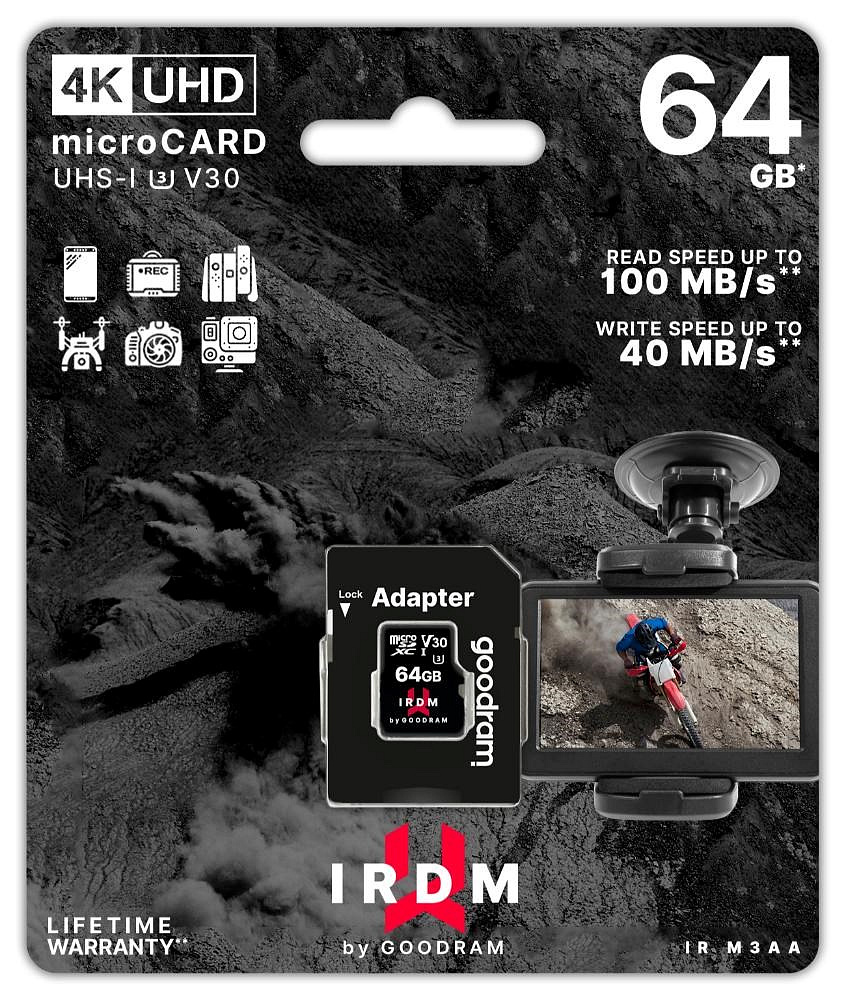 Karta IRDM s rychlostní třídou UHS-I 3 (U3) a třídou rychlosti videa 60 (V60) vám umožní zachytit dokonalý okamžik v široké škále aplikací, bez ohledu na to, zda se jedná o akční kameru, dron, přenosnou herní konzoli, kameru nebo jiné špičkové zařízení.