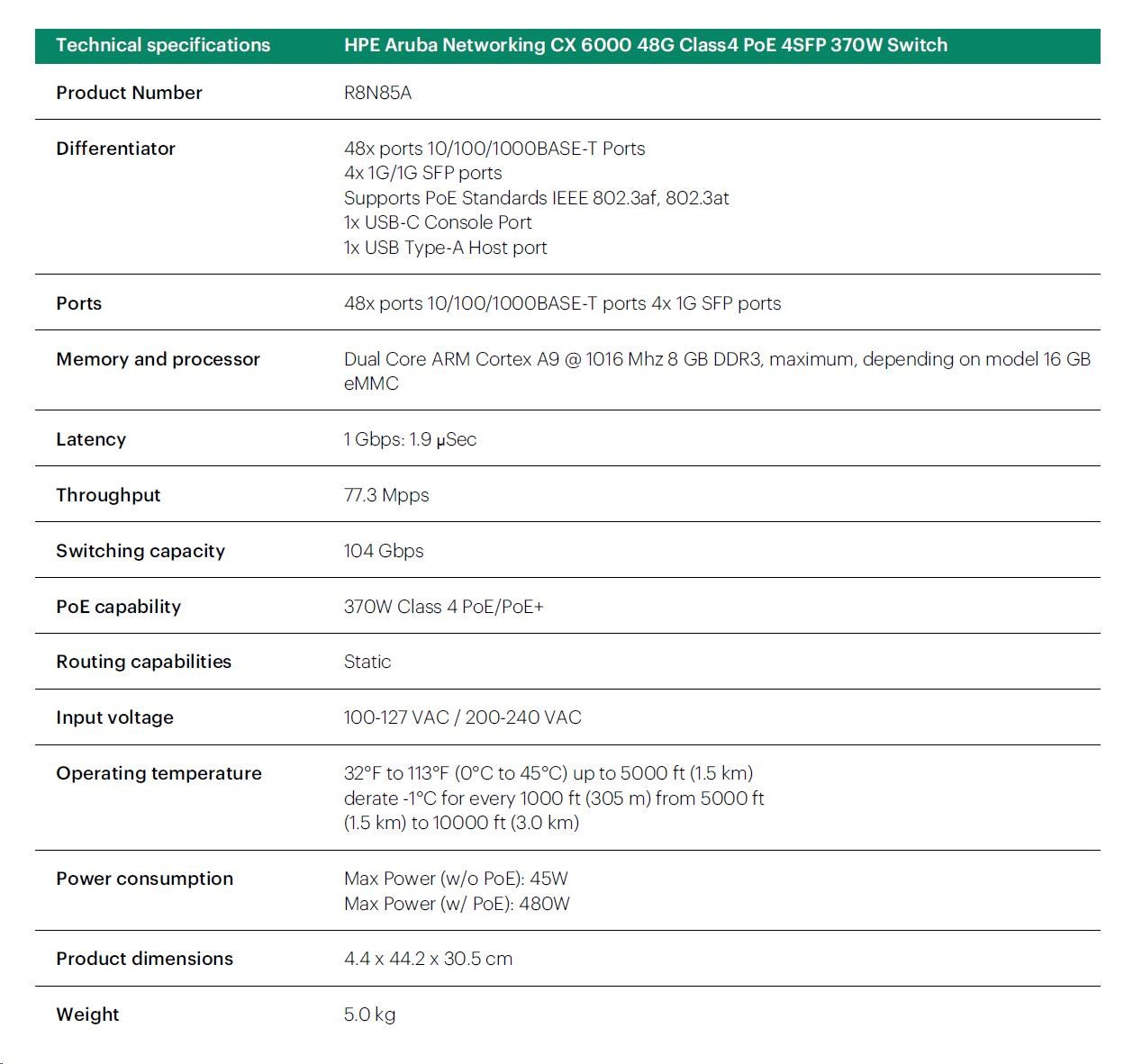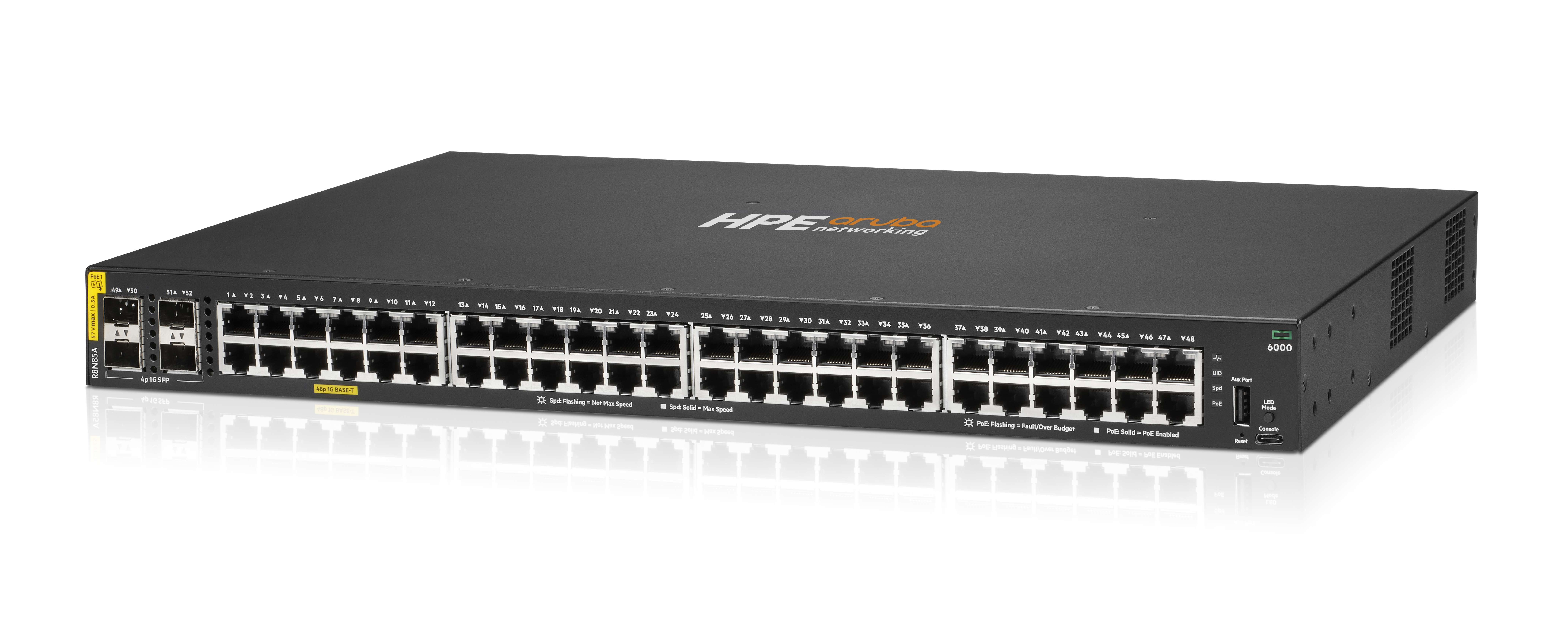 Aruba 6000 48G Class4 PoE 4SFP 370W Switch (R8N85A) | Aruba 6000 48G 4SFP Switch (R8N86A) | Aruba 6000 24G Class4 PoE 4SFP 370W Switch (R8N87A) | |
