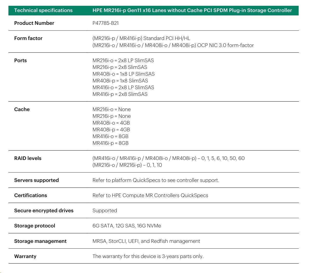 HPE MR216i-p Gen11 16 Internal Lanes/No Cache SPDM PCI Plug-in Storage Controller (raid 0,1,10 only).