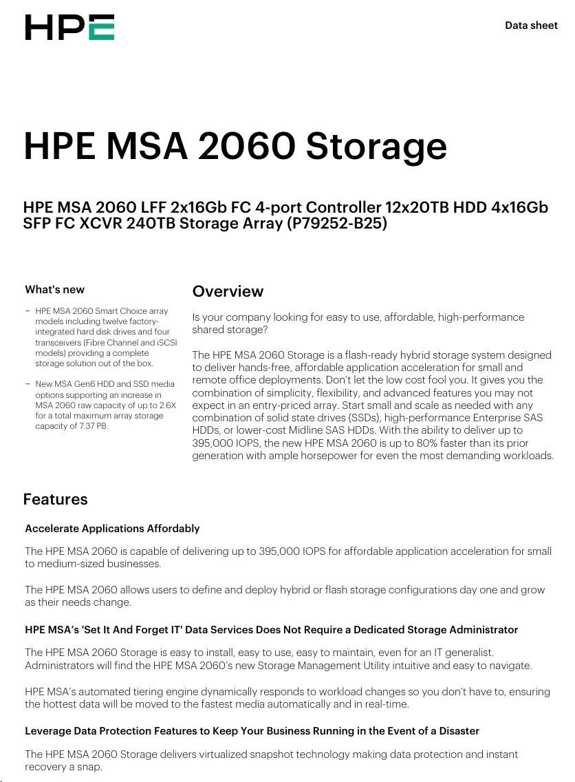 Is your company looking for easy to use, affordable, high-performance shared storage? The HPE MSA 2060 Storage is a flash-ready hybrid storage system designed to deliver hands-free, affordable application acceleration for small and remote office deployments. Don’t let the low cost fool you. It gives you the combination of simplicity, flexibility, and advanced features you may not expect in an entry-priced array. Start small and scale as needed with any combination of solid state drives (SSDs), highperformance Enterprise SAS HDDs, or lower-cost Midline SAS HDDs. With the ability to deliver up to 395,000 IOPS, the new HPE MSA 2060 is up to 80% faster than its prior generation with ample horsepower for even the most demanding workloads.