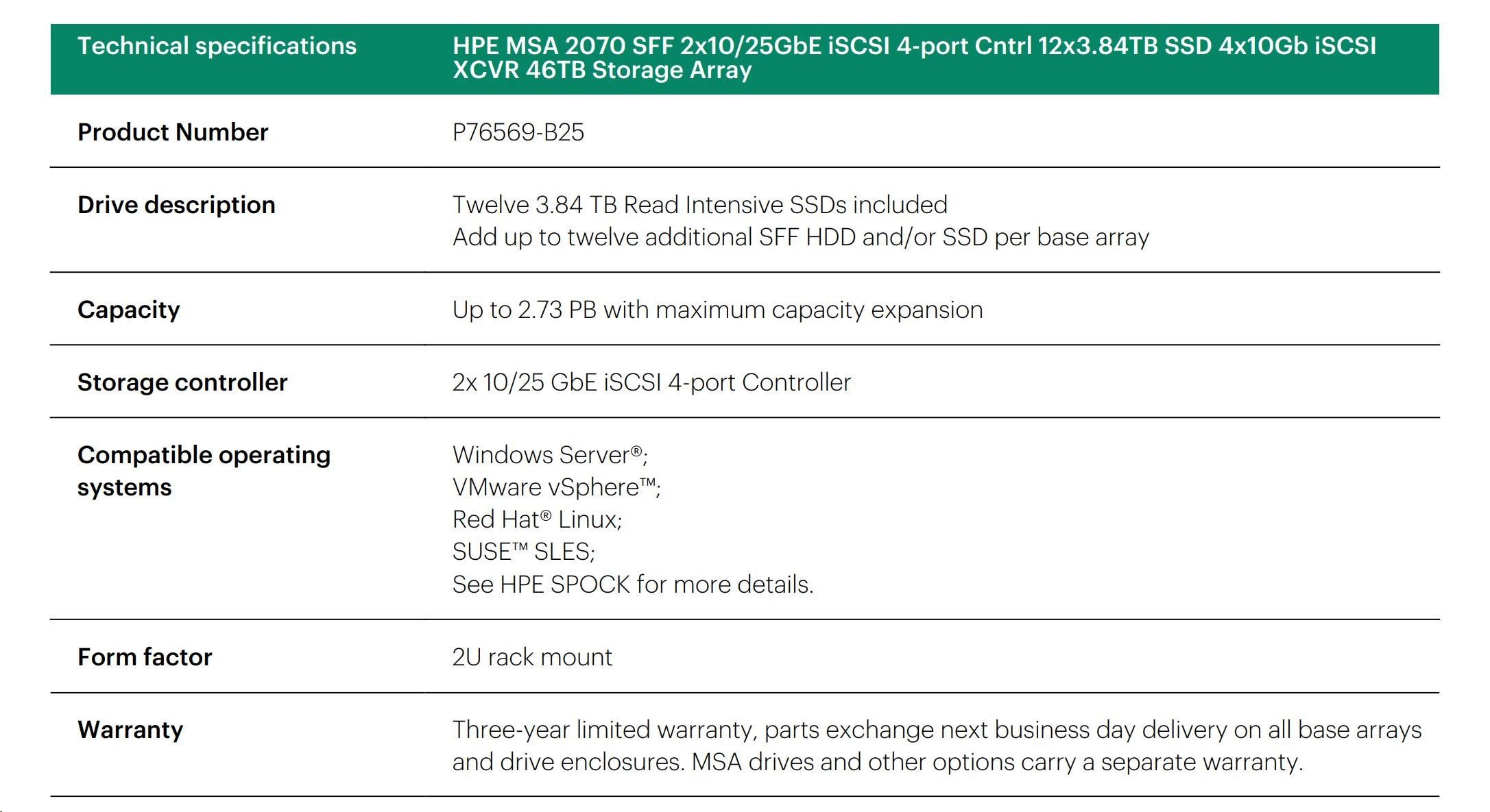 HPE MSA 2070 SFF 2x10/25GbE iSCSI 4-port Cntrl 12x3.84TB SSD 4x10Gb iSCSI XCVR 46TB Storage Array Smart Choice