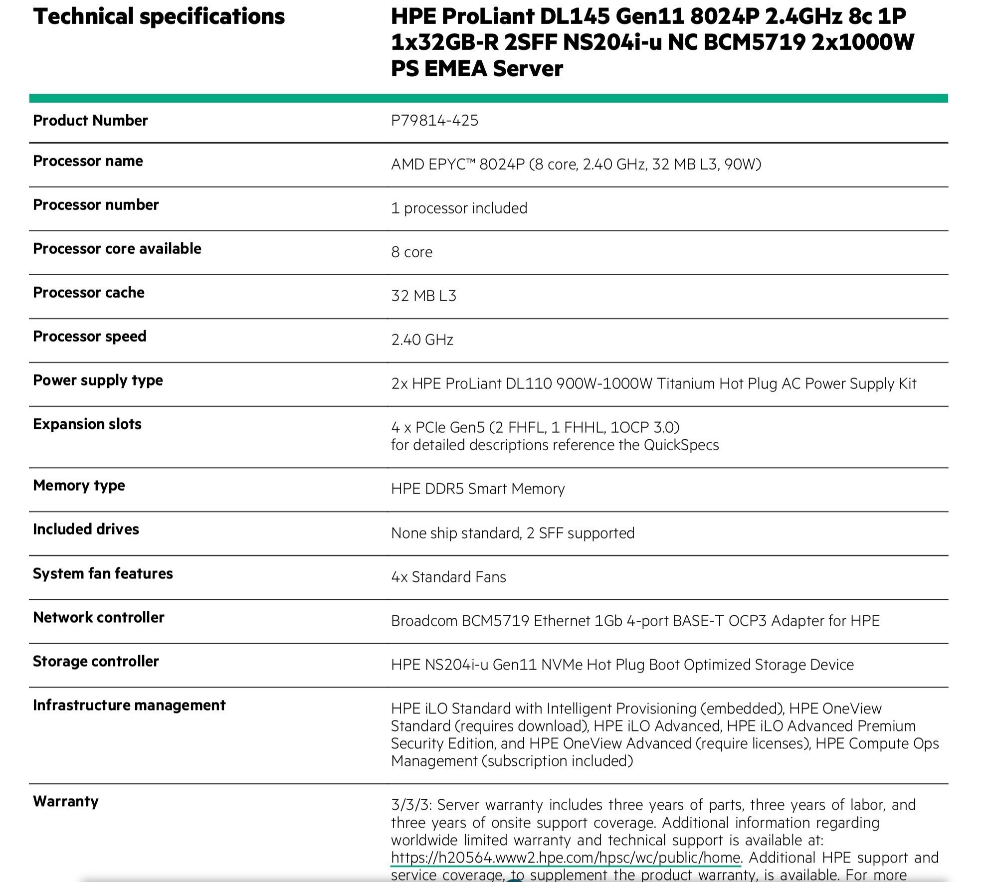 Processor name | AMD EPYC™ 8024P (8core, 2.4GHz 32MB L3 90W) |