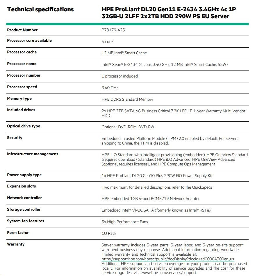 HPE PL DL20g11 E-2434 (3.4G/4C) 1x32G 2x2TB/7.2k SATA VROC 2LFF-HP 290W Smart Choice.