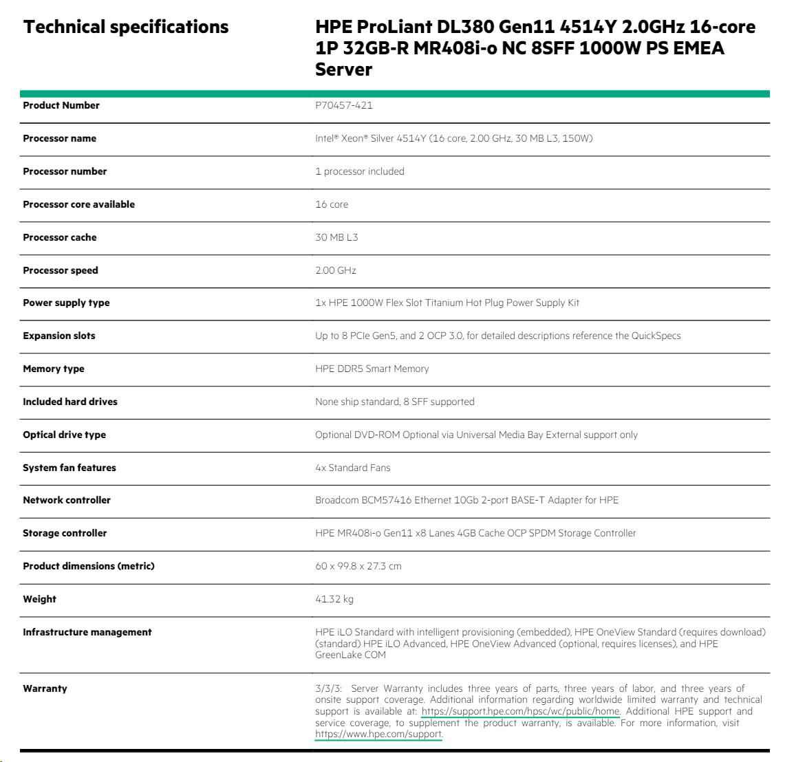 | Model Name | HPE ProLiant DL380 Gen11 5416S 2.0GHz 16c 1P 2x32GB-R 8SFF MR408i-o 2x480GB SSD 2x1000W PS EU Server | HPE ProLiant DL380 Gen11 5515+ 3.2GHz 8c 1P 2x32GB-R 8SFF MR416i-o 2x480GB SSD 2x1000W PS EU Server |