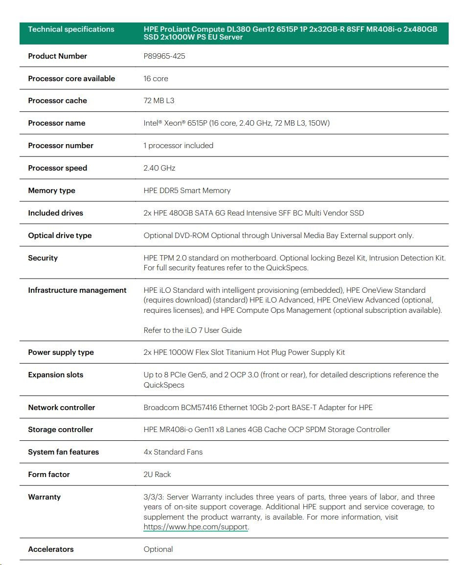 HPE PL DL380g12 6515P (2.4/16C) 2x32G (P69727) 2x480G MR408i-o 8SFF 2x1000W 2p10G-T NBD333 Smart Choice.
