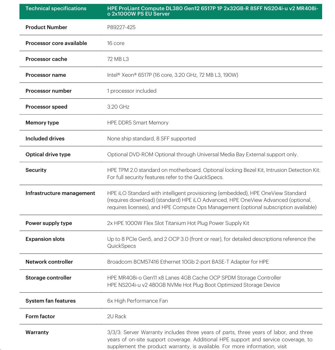 HPE PL DL380g12 6515P (2.2/16C) 2x32G (P69727) 2x480G MR408i-o 8SFF 2x1000W 2p10G-T NBD333 Smart Choice