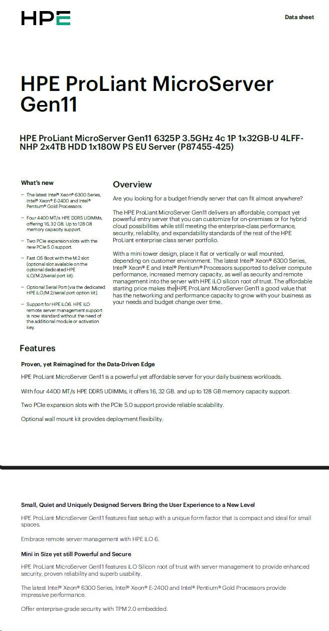 HPE PL MicroServer Gen11 6325P (3.5/4C) 1x32G 2x4TB SATA 4LFF/SFF-NHP VROC 4p1G NBD111 Smart Choice