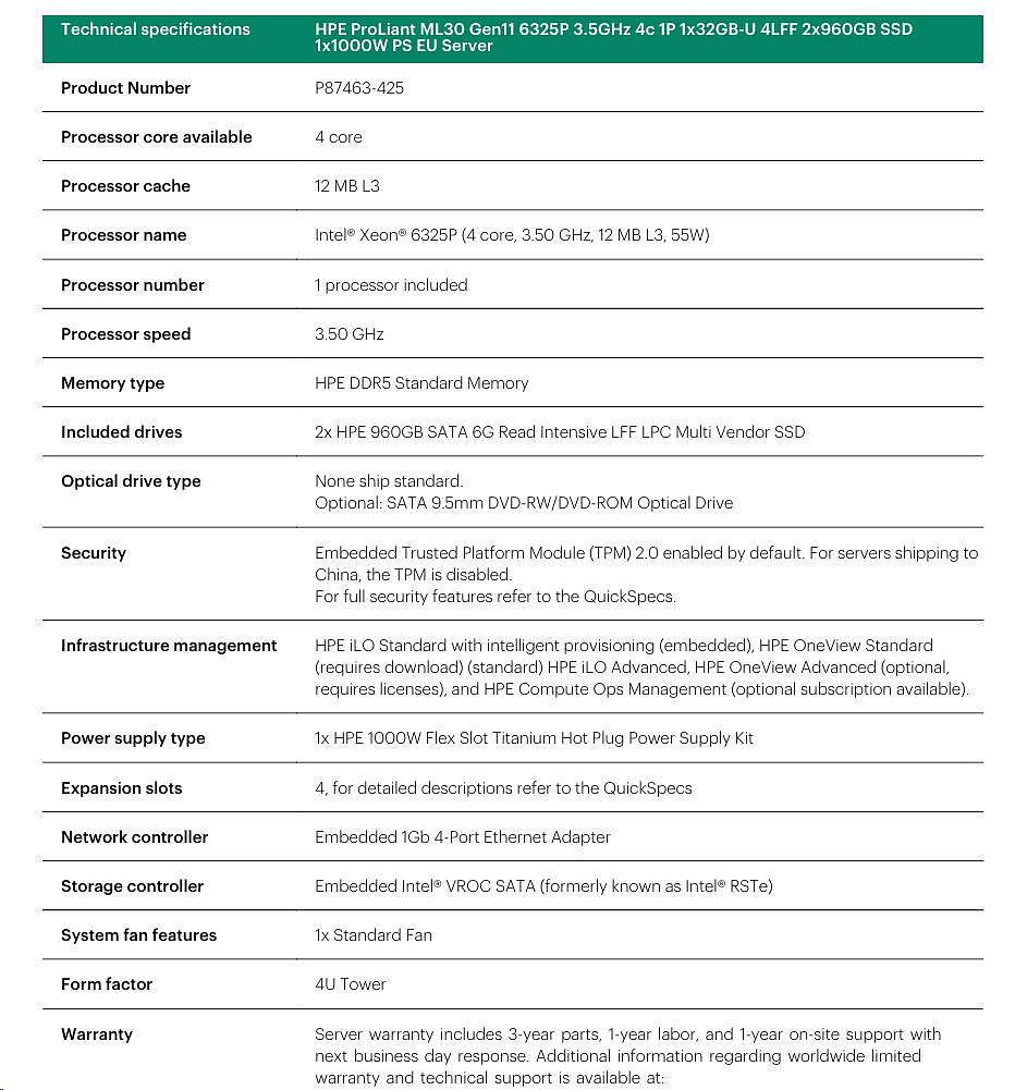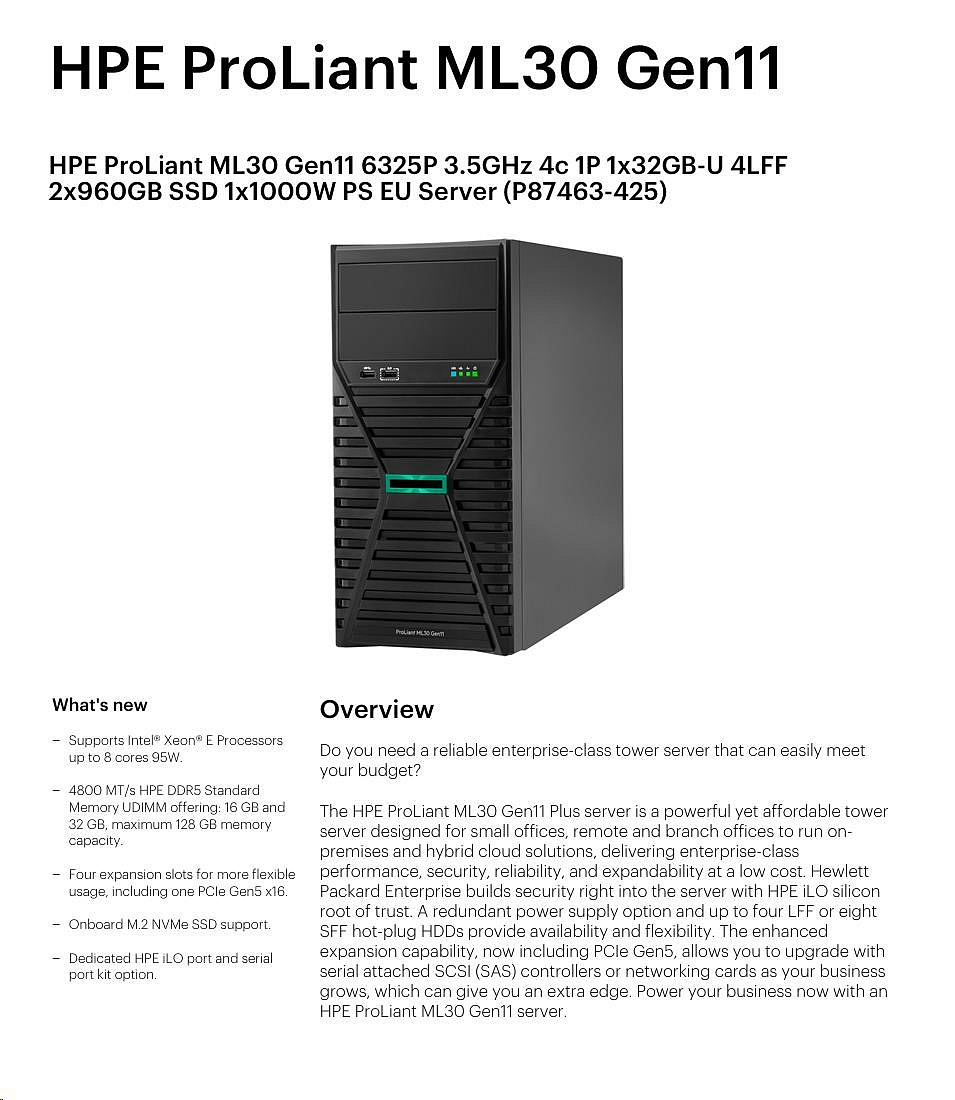 HPE PL ML30g11 6325P (3.5G/4C8T) 1x32G 2x960G SSD SATA 4LFF-HP VROC 1x1000W 4p1G NBD311 Smart Choice.