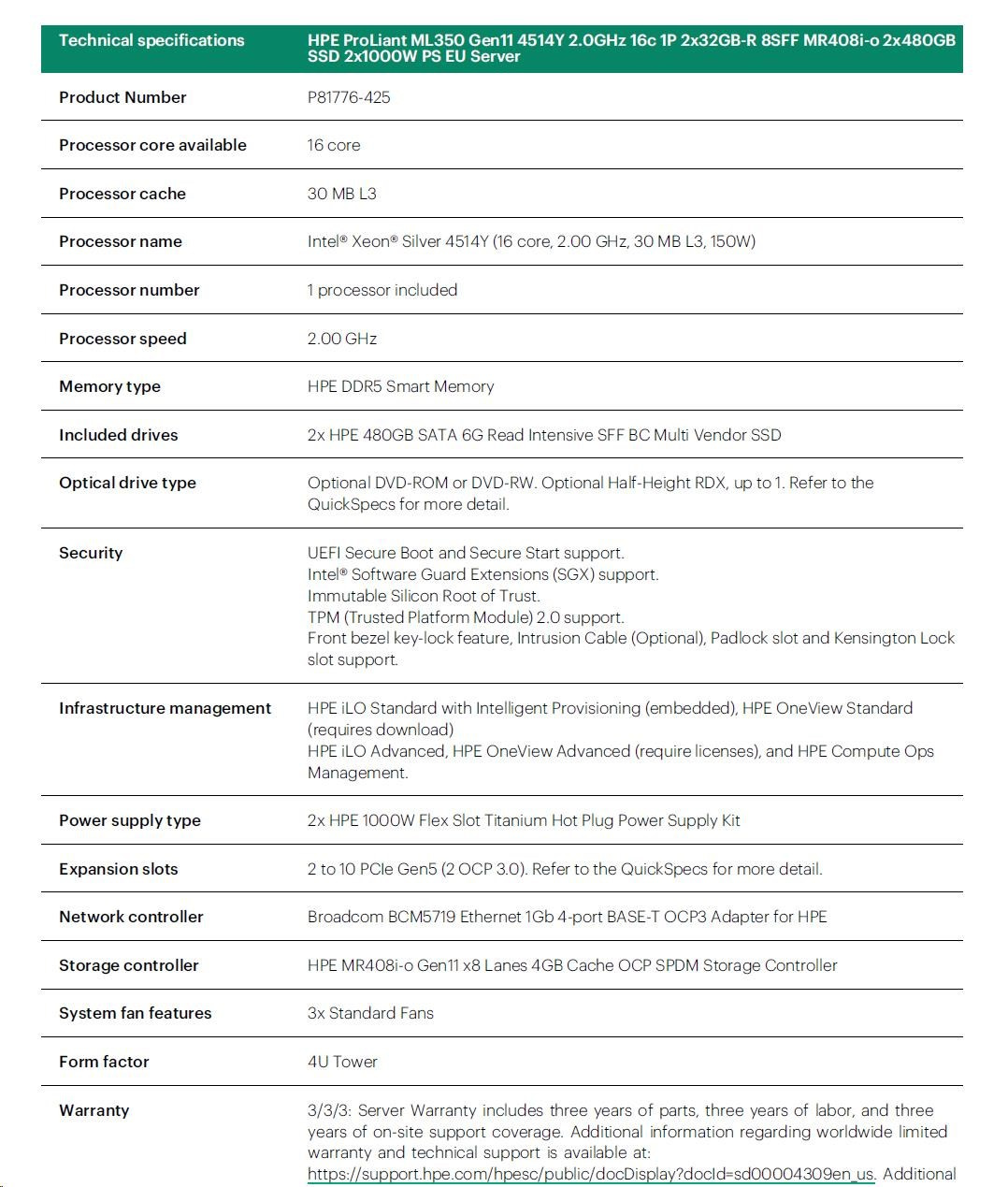Model Name | HPE ProLiant ML350 Gen11 4514Y 2.0GHz 16c 1P 2x32GB-R 8SFF MR408i-o 2x480GB SSD 2x1000W PS EU Server |