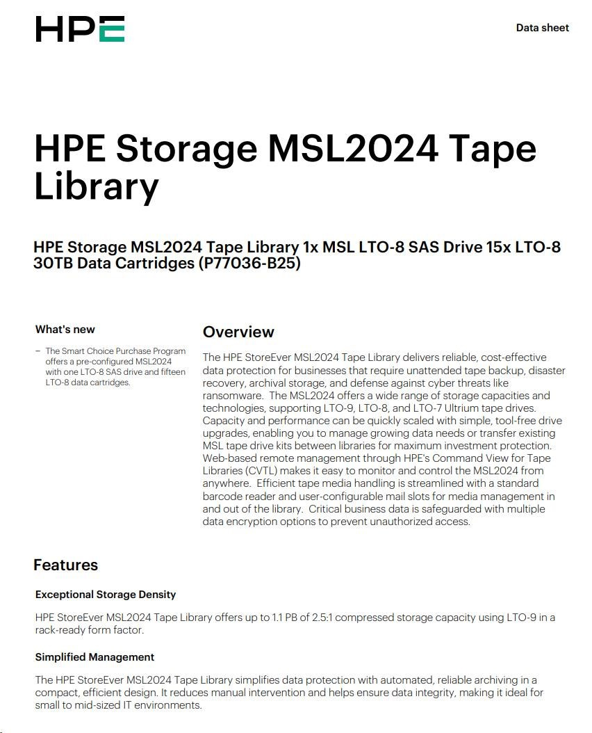 HPE Storage MSL2024 Tape Library 1x MSL LTO-8 SAS Drive 15x LTO-8 30TB Data Cartridges.