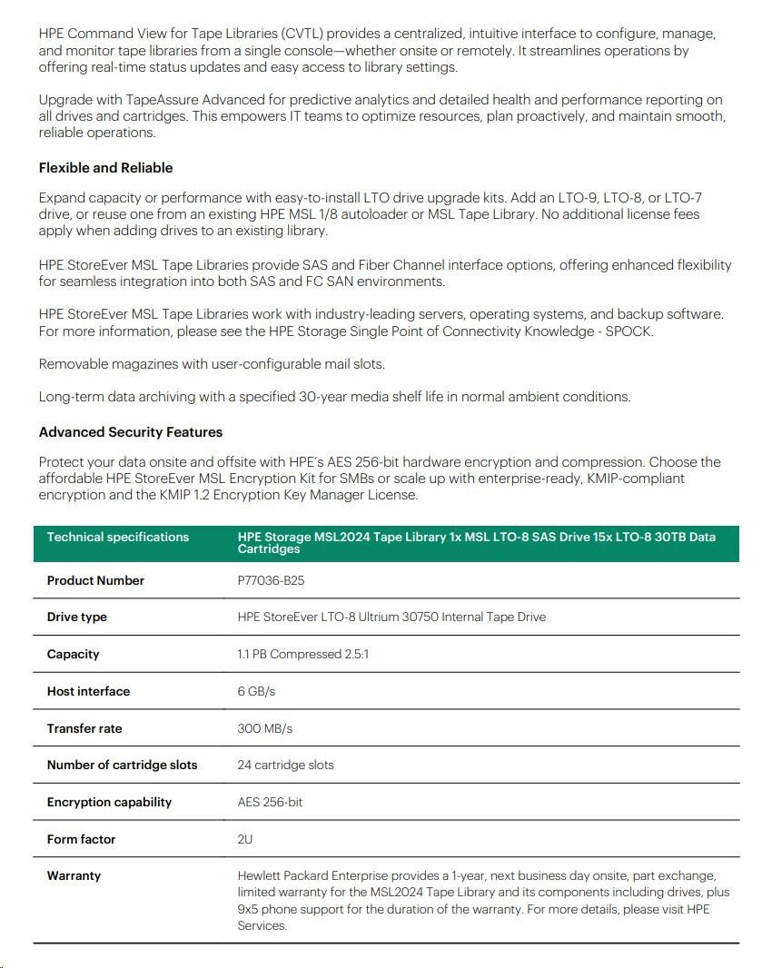 HPE Storage MSL2024 Tape Library 1x MSL LTO-8 SAS Drive 15x LTO-8 30TB Data Cartridges