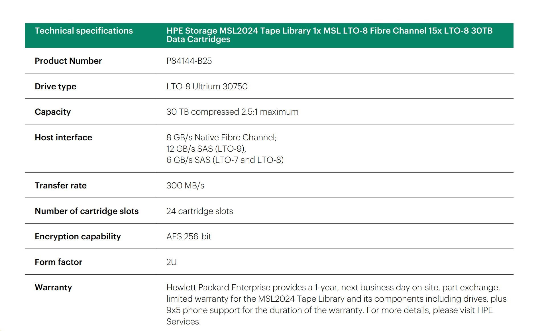 HPE Storage MSL3040 Tape Library 1x MSL LTO-9 Fibre Channel 20x LTO-9 45TB Data Cartridges