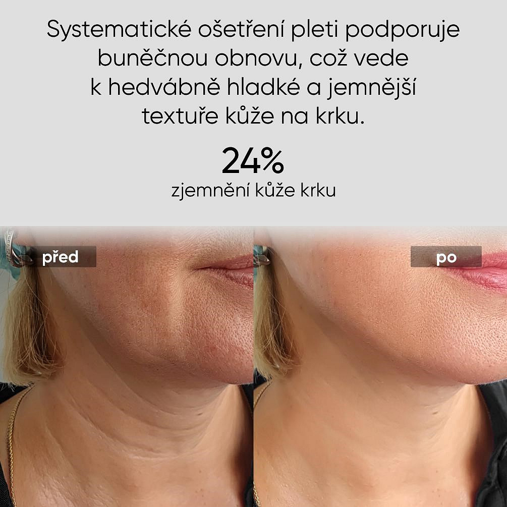 - Viditelné omlazení a zpevnění: Podporuje syntézu kolagenu, vyhlazuje jemné vrásky a navrací pokožce pevnost a pružnost.