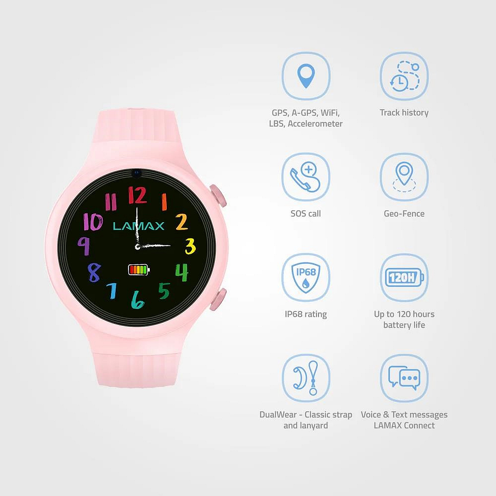 Dětské GPS hodinky, hlasové a textové zprávy, videohovory, určování polohy PinPoint®, bezpečnostní zóny, DualWear®, SOS tlačítko, funkce FriendsConnect® - propojení až 60 kamarádů, propojení všech členů rodiny díky FamilyCareConnect®, aplikace LAMAX Connect v češtině, šifrované spojení, výdrž až 120 hodin, krokoměr, připomínky, voděodolné, 1,2'' barevný dotykový displej s Gorilla Glass, SIM karta 200MB v balení