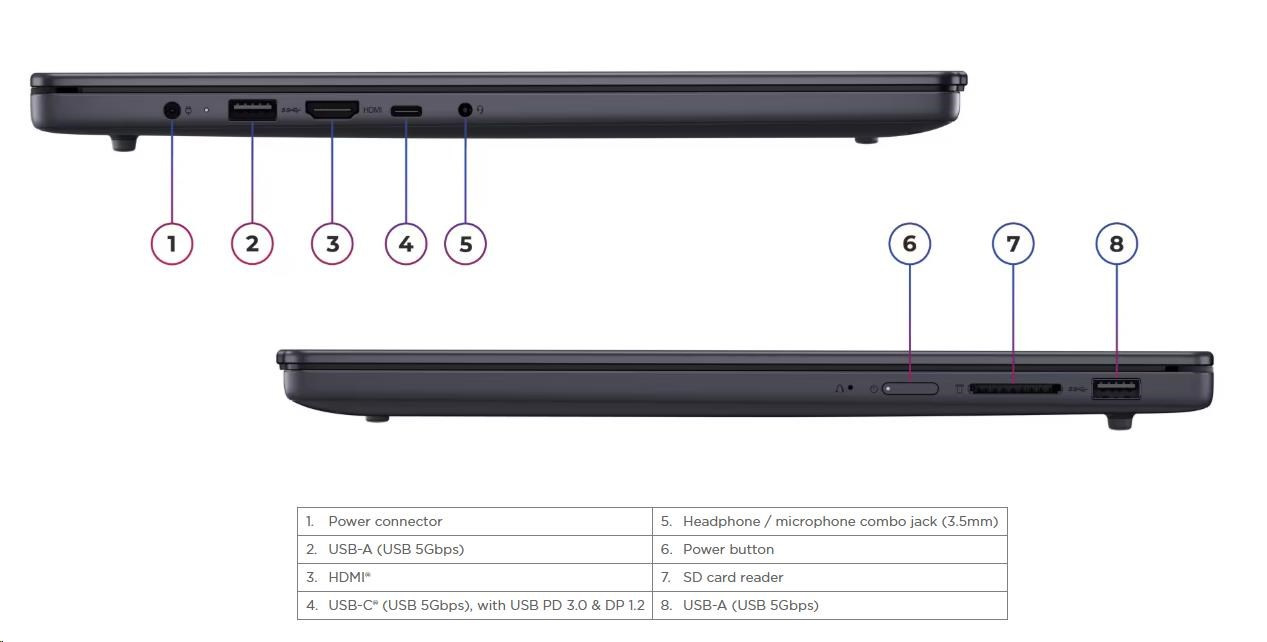 | Standartné porty | 2x USB-A (USB 5Gbps / USB 3.2 Gen 1) 1x USB-C® (USB 5Gbps / USB 3.2 Gen 1), with USB PD 3.0 and DisplayPort™ 1.2 1x HDMI® 1.4 1x Headphone / microphone combo jack (3.5mm) 1x SD card reader 1x Power connector |