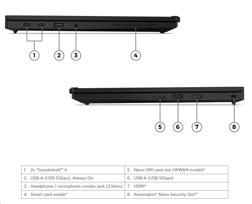 | Standartné porty | 2x USB-A (USB 5Gbps / USB 3.2 Gen 1), one Always On 2x USB-C® (Thunderbolt™ 4 / USB4® 40Gbps), with USB PD 3.1 and DisplayPort™ 2.1 1x HDMI® 2.1, up to 4K/60Hz 1x Headphone / microphone combo jack (3.5mm) Optional Ports (configured) 1x Smart Card Reader 1x Nano-SIM Card Slot |