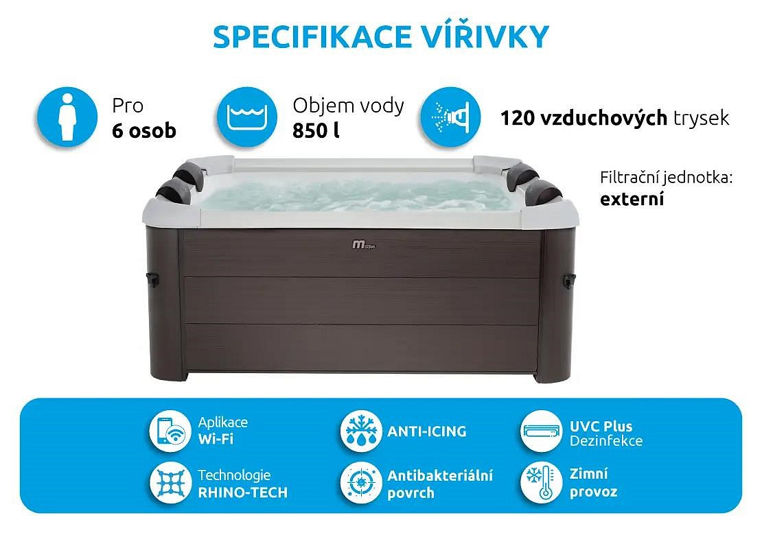 Funkce vířivkyUV dezinfekce vody; Ovládání mobilní aplikací; Možnost provozu v zimě; Antibakteriální povrch