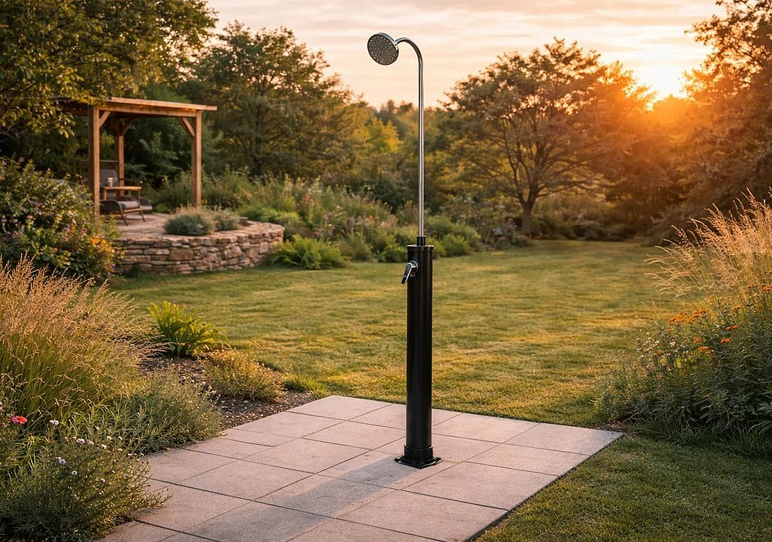 Solární sprchy se dají využívat samostatně, ale můžou tvořit i doplněk k bazénům. Pomáhají tak před zbytečným znečištěním bazénové vody například od trávy či hlíny.