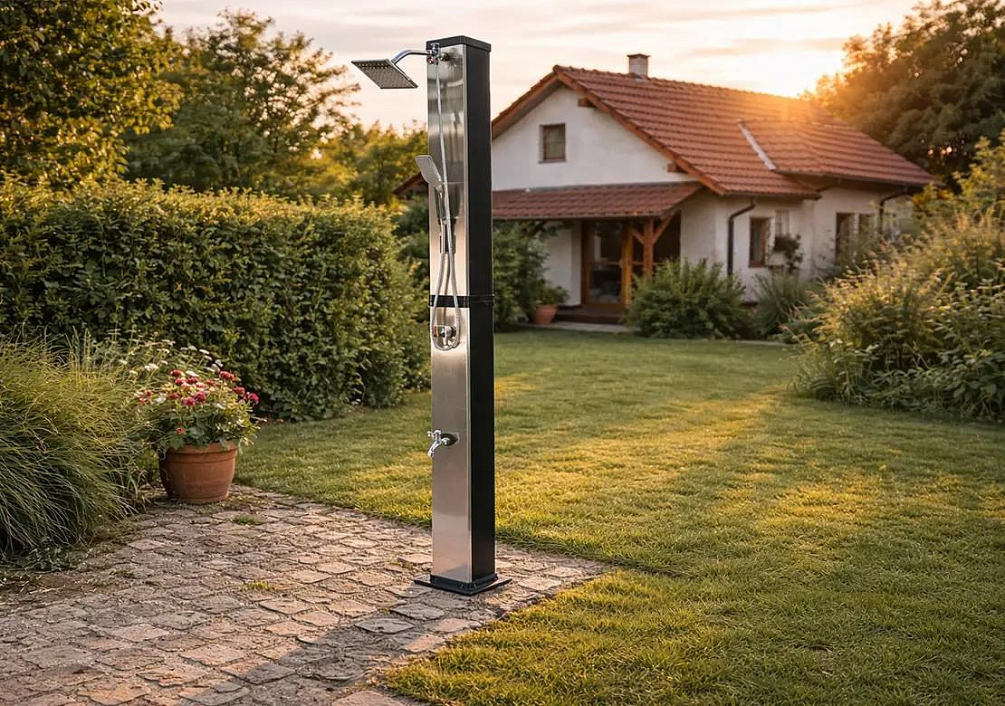 Solární sprchy se dají využívat samostatně, ale můžou tvořit i doplněk k bazénům. Pomáhají tak před zbytečným znečištěním bazénové vody například od trávy či hlíny.