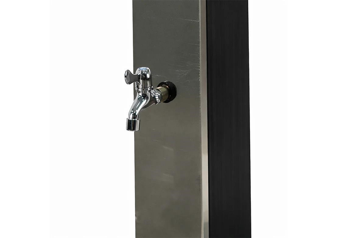 Zahradní dvoudílná a skladná sprcha DUO s objemem 40 l pro venkovní použití zajistí ohřev vody přiváděné ze zahradní hadice a tím perfektní pocit pohodlí při sprchování teplou nebo vlažnou vodou. Sprcha má pákovou baterii, ruční sprchu i kohoutek na oplach nohou. Ohřev vody zajišťuje sluneční záření a tělo sprchy, které funguje jako solární kolektor. Pro sprchování musí být zahradní sprcha stále napojena na vodovodní řad. Není-li napojena, nelze se sprchovat. Sprcha se kotví pomocí 4 šroubů (nejsou součástí balení) pevně k zemi, čímž je zajištěna její perfektní stabilita.