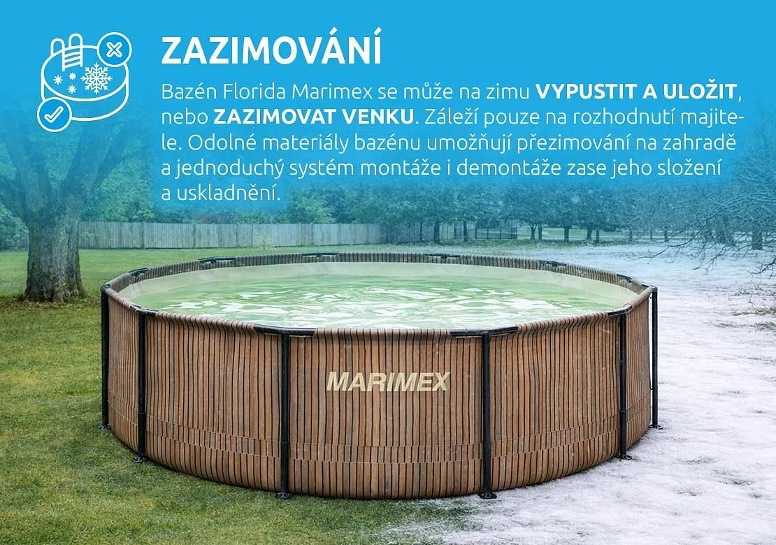 U bazénu Florida Marimex si můžete vybrat, zda bazén vypustíte, složíte a uvolníte zahradu pro jiné aktivity, nebo ho zazimujete a ponecháte venku. Materiály bazénu jsou odolné a uzpůsobené pro zazimování v zimě.