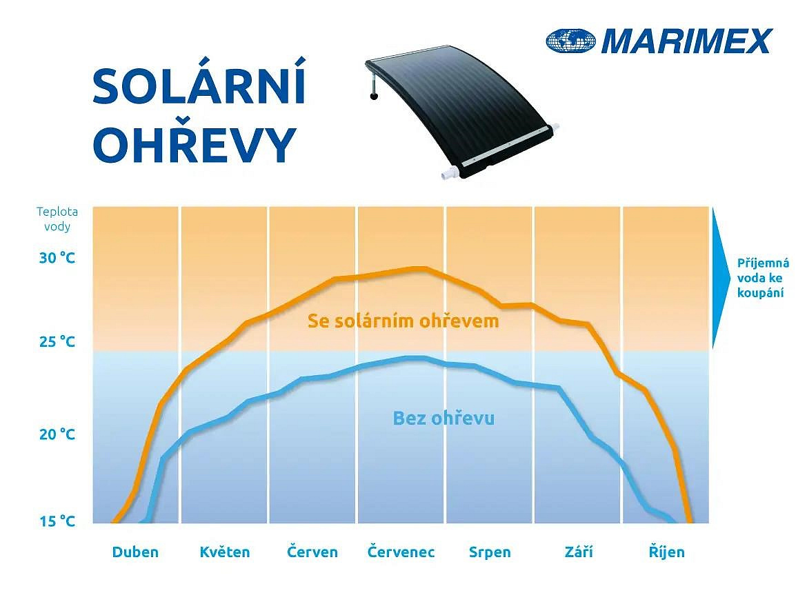 Pouze díky působení slunečních paprsků a průtoku vody umožní solární ohřev ohřát vodu v bazénu až o 6 °C, a to doslova zadarmo.