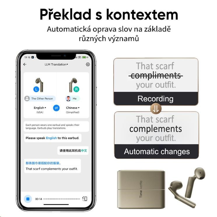 Překonejte jazykové bariéry v reálném čase s AI tlumočníkem a překladatelem Timekettle W4. Podporuje obousměrný překlad ve 42 jazycích a 95 dialektech, takže konverzace mezi různými kulturami je plynulá a přirozená. Ať už cestujete, pracujete nebo poznáváte nové lidi, W4 zajistí, že každé slovo bude správně pochopeno. Rozlučte se s trapnými pauzami a jazykovými nedorozuměními – stačí mluvit a AI se postará o zbytek. Komunikujte svobodně a sebevědomě kdekoliv na světě bez jazykových omezení. Přesnost překladu je až 98% a AI slovník na principu velkých jazykových modelů (LLM) zajistí díky perfektnímu porozumění přesnou opravu podobně znějících slov a celkovému porozumění kontextu konverzace. Aplikace Timekettle vám navíc z konverzací vytvoří přepis a AI shrnutí.