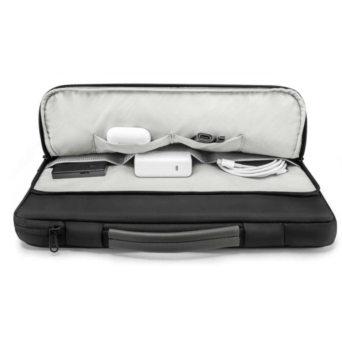 Univerzální brašna Tomtoc je sice dimenzována pro 16“ MacBook Pro, vyhovuje však většině zařízení o velikosti 16 palců a méně. Díky nenápadné černé barvě a nadčasovému designu padne k obleku i volnočasovému outfitu. Kromě velké kapsy na notebook obsahuje prostornou přední kapsu s propracovaným členěním pro uložení veškerého příslušenství i osobních potřeb.