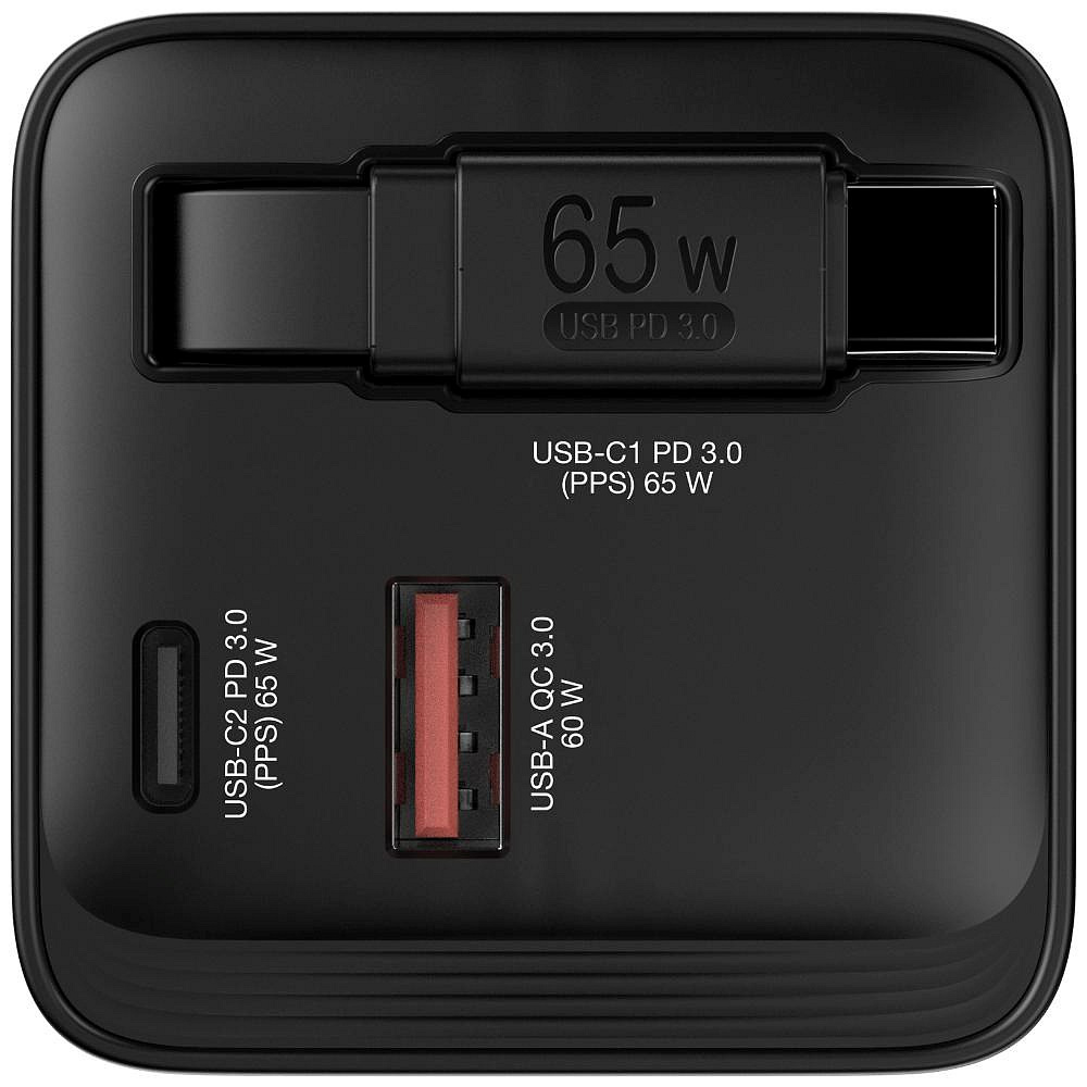 - 65W GaN nástěnná nabíječka se zatahovacím kabelem USB-C® PD 65W a 2 výstupními porty: 1 x USB-C PD 65W a 1 x USB-A QC 3.0